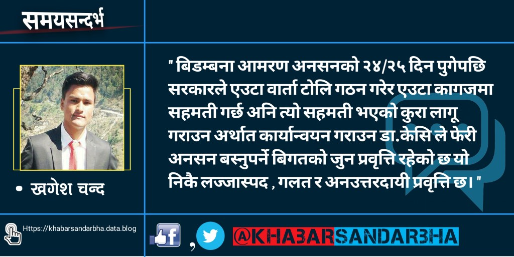 बिडम्बना आमरण अनसनको २४/२५ दिन पुगेपछि सरकारले एउटा वार्ता टोलि गठन गरेर एउटा कागजमा सहमती गर्छ अनि त्यो सहमती भएको कुरा लागू गराउन अर्थात कार्यान्वयन गराउन डा.केसि ले फेरी अनसन बस्नुपर्ने बिगतको जुन प्रवृत्ति रहेको छ यो निकै लज्जास्पद , गलत र अनउत्तरदायी प्रवृत्ति छ।