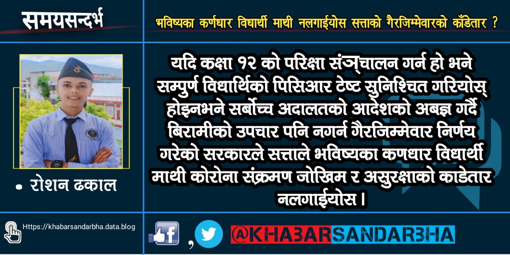 यदि कक्षा १२ को परिक्षा संञ्चालन गर्न हो भने सम्पुर्ण विधार्थिको पिसिआर टेष्ट सुनिश्चित गरियोस् होइनभने सर्बोच्च अदालतको आदेशको अबज्ञ गर्दै बिरामीको उपचार पनि नगर्न गैरजिम्मेवार सत्ताले भविष्यका कणधार विधार्थी माथी कोरोना संक्रमण जोखिम र असुरक्षाको काडेतार नलगाईयोस।