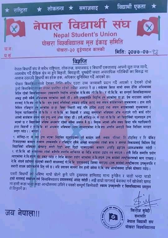 नेविसंघ पोखरा बिश्वबिद्यालय मुल इकाई समितिका सभापति फिरोज सुवेदिले बिहीवार बिज्ञप्ती जारी गर्दै कारबाहीको माग गरेका हुन।